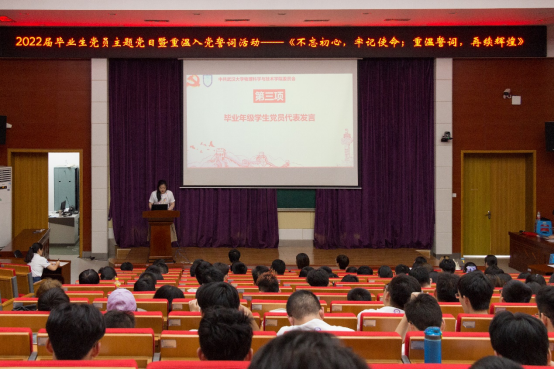 最后是激动人心的重温入党誓词环节。全体毕业生党员齐举右拳,在党委书记余向红的带领下又一次庄严宣誓。现场庄重而肃穆,“对党忠诚、不负人民”的誓词铿锵有力、叩人心弦,昔日入党时的激动心情涌入心间。共产党人的初心与使命在宣誓仪式的洗涤下愈发光辉。