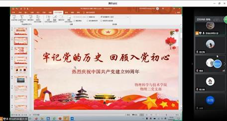 物理二党支部的党员同学及积极分子通过腾讯会议组织召开了“牢记党的历史 回顾入党初心”的主题党日。本次活动围绕共产党的历史、支部同学回顾入党初心展开,支部书记唐庆航同学主持此次会议。