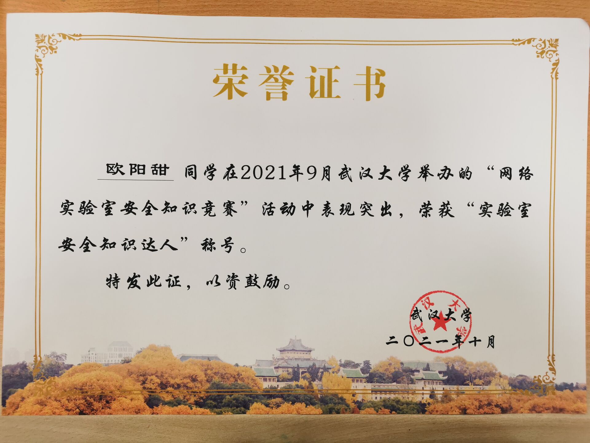 骰宝规则 于2021915日至925日开展了网络实验室安全知识竞赛,骰宝规则 研究生欧阳甜获“实验室安全达人”荣誉称号。